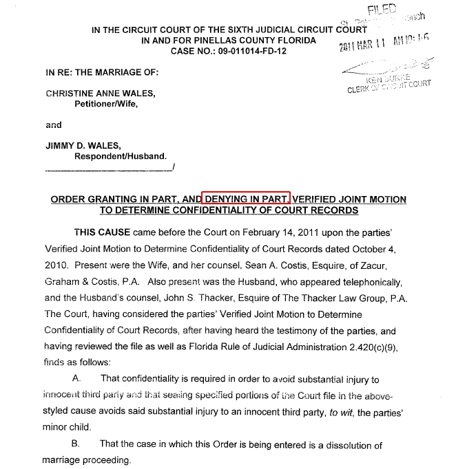 Records confidentiality denied in part, re Jimmy Wales, from Pinellas County divorce CASE No 09-011014-FD-12.