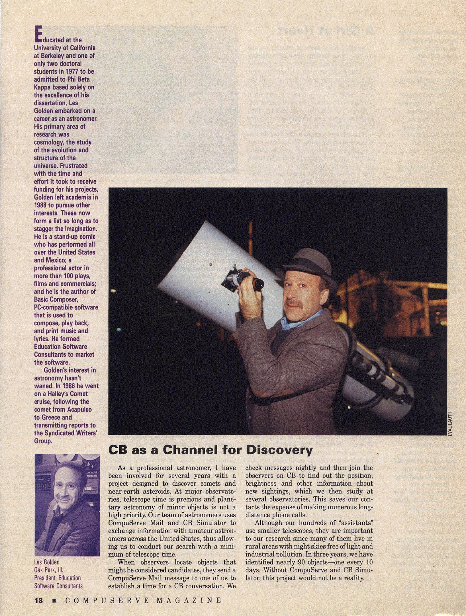 | 21:09, 3 January 2012 | LesGoldenAsteroidDiscovery.jpg (file) | 887 KB | Leslie M. Golden, Les Golden, Ph.D, astronomer, professor, actor, comedian, musician, environmentalist, of Oak Park Illinois. His use of the internet to enlist amateur astronomers world-wide was heralded in an article in Compuserve Magazine, which also d | 1 | |