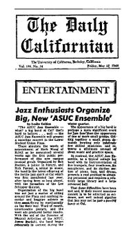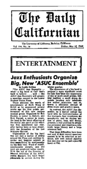 | 01:30, 6 December 2011 | DailyCalArticlebyLesGoldenUCJazz1968.jpg (file) | 254 KB | Les Golden of Oak Park Illinois, trumpet player, jazz vocalist, and announcer, writes article for Daily Californian in 1968 about first concert of the University of California Jazz Ensembles | 1 | |