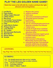 | 14:25, 23 December 2011 | LesGoldenNameGame.jpg (file) | 111 KB | Professor Leslie M. Golden of Oak Park Illinois, an astronomer, gambling writer, stand-up comedian, actor, musician, and environmentalist is a true polymath, a Renaissanced Man. His numerous activities have provided him with numerous names. Play the Les | 1 | |